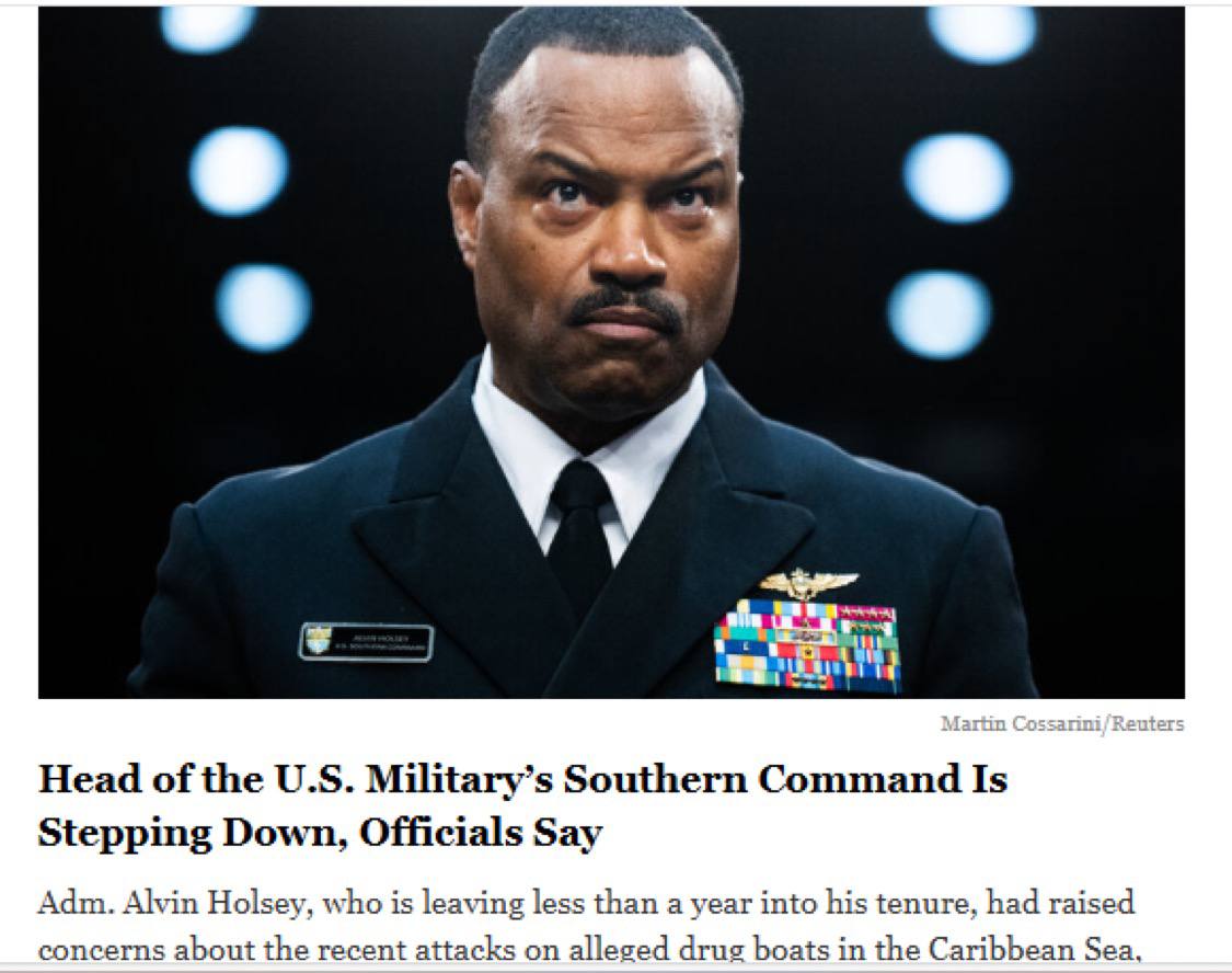U.S. Admiral Alvin Holseystepping down after he "raised concerns about the mission and the attacks on the alleged drug boats"